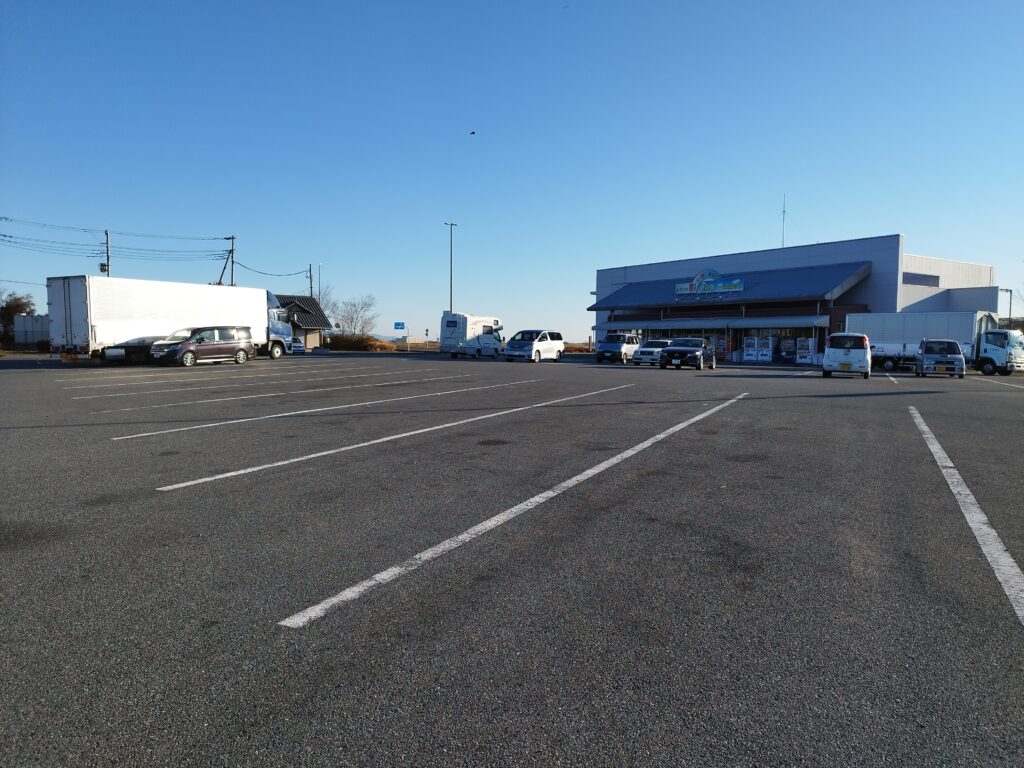 ちなみに上の写真では駐車場の中央エリアに停めてしまっていますが、よく見たらここは大型の車も停められるスペースだったので、買い物&お風呂から戻った後には、国道寄りの小さいマスのほうに移動しています。