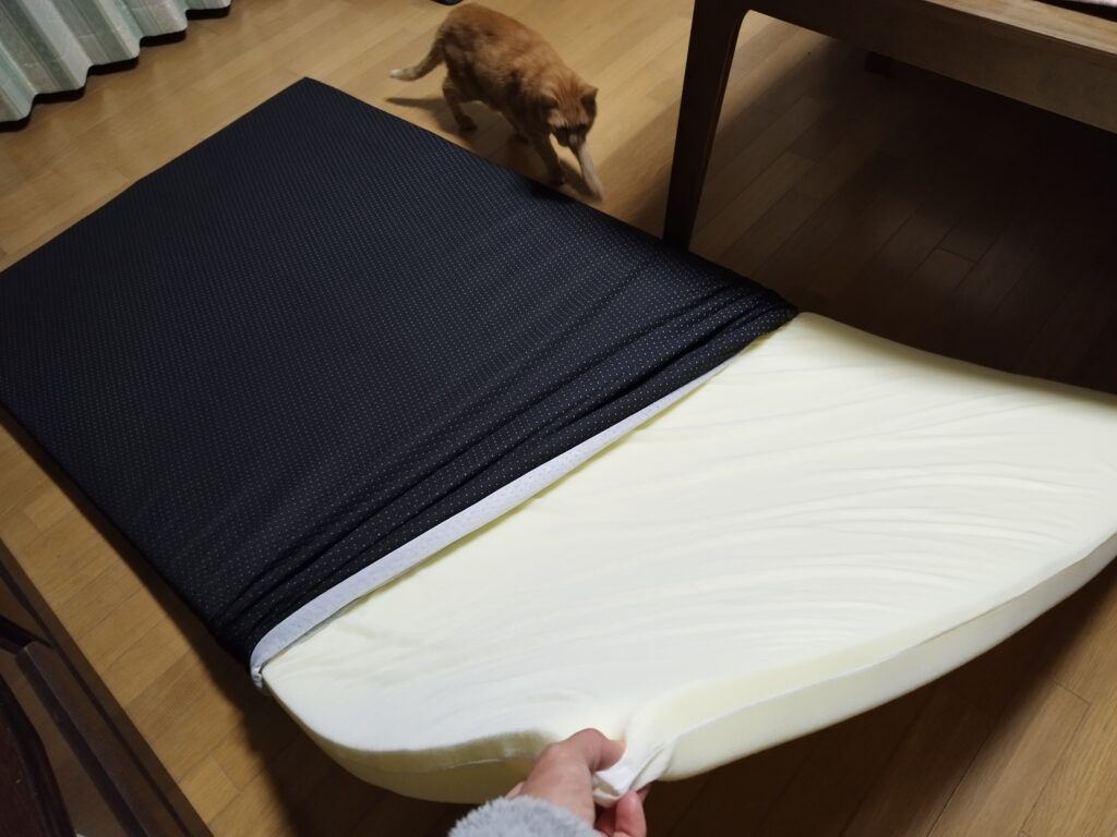 ただこれだと、まっすぐ寝るならいいのですが斜めに寝るだと枕部分との角度ができてしまいちょっと落ち着かず、結局25cm幅×2本を重ねて入れていたのを1本に減らし、その部分を身体の向きに合わせて斜めにずらすことにしました。