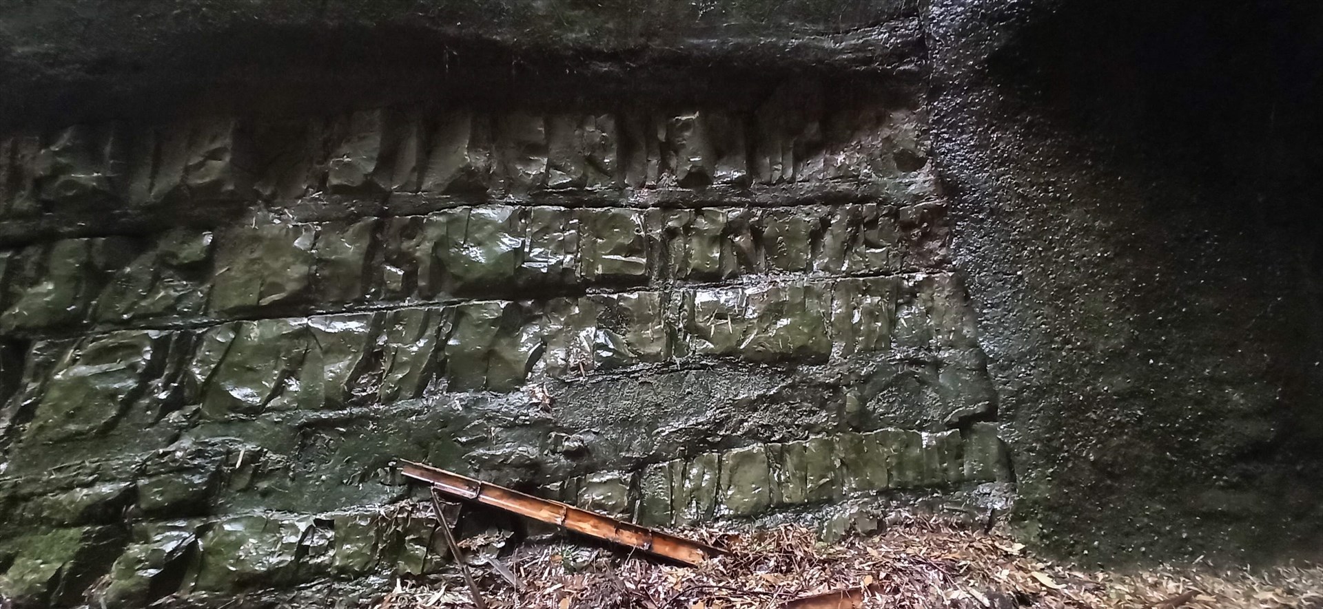 トンネルは、ポータル部分も内壁もモルタル吹付補強されている。