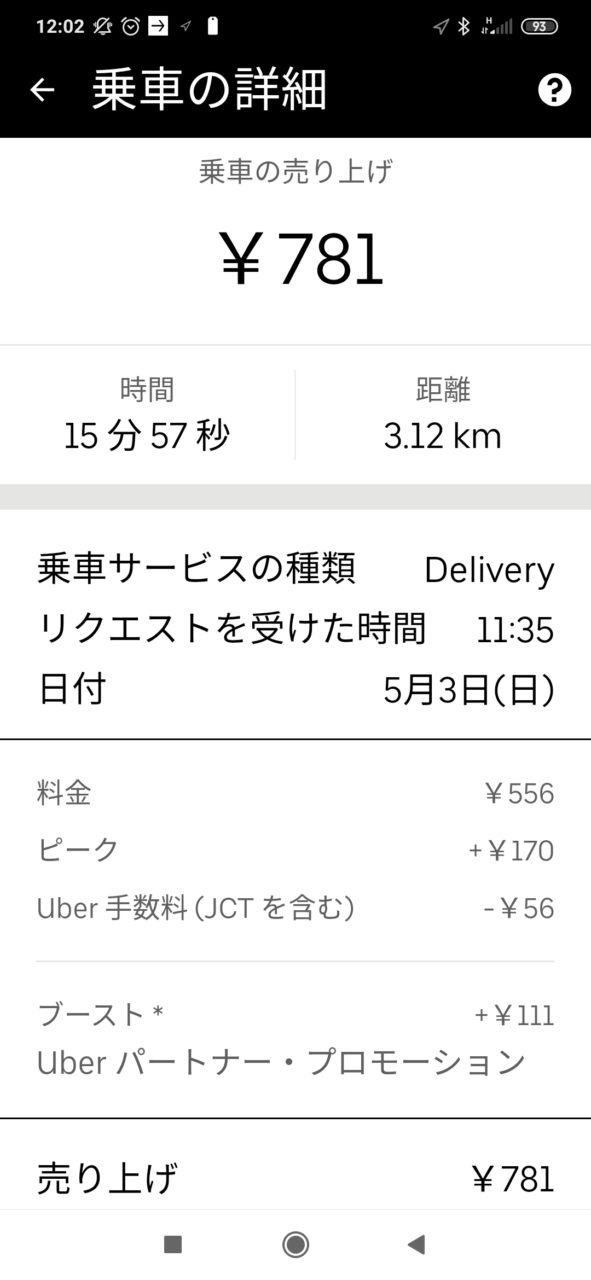 途中、なんどか休憩などもしてしまったのですが、14回(うち2回は配達先が2か所)の配達で9,216円。一回あたりの平均金額は658円でした。