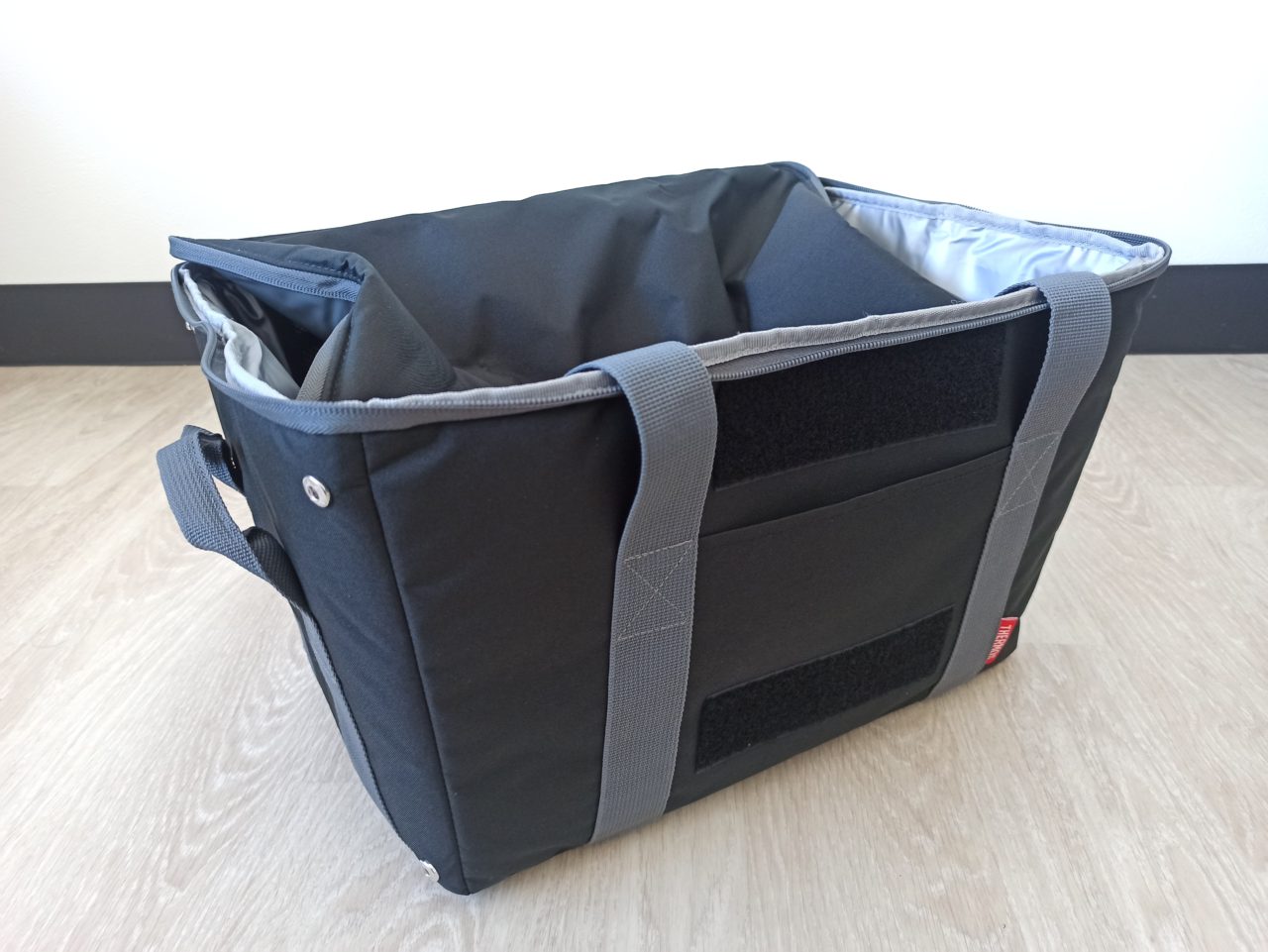 ただ広くなったことによるデメリットもあります。商品を入れたビニール袋や紙袋の転倒です。なので古いバッグの中にあった仕切り板を取り付けられるよう、内側にも面ファスナーを貼りたいと思います。その作業はまた後日レポートします。